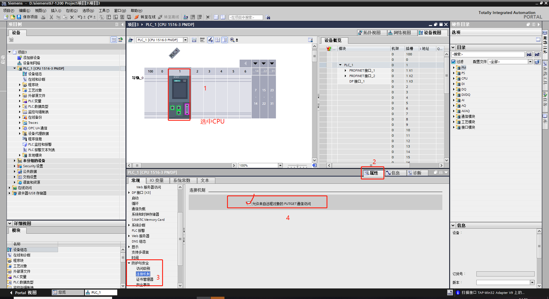 1.進(jìn)入博圖,“常規(guī)-保護(hù)”,連接機(jī)制勾選“允許從遠(yuǎn)程伙伴使用PUT/GET通信訪問”,重啟PLC。