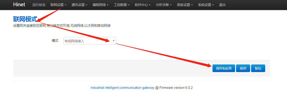 1. 網(wǎng)關(guān)后臺聯(lián)網(wǎng)模式是否正確,進(jìn)網(wǎng)關(guān)后臺,點擊“聯(lián)網(wǎng)設(shè)置 - 聯(lián)網(wǎng)模式”,修改模式為“有線網(wǎng)絡(luò)接入”,再點擊【保存應(yīng)用】,重啟網(wǎng)關(guān)生效。